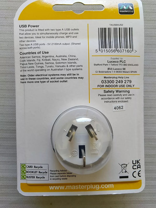 Masterplug UK to Australia Power Adaptor Plug with 2 USB (A) Ports