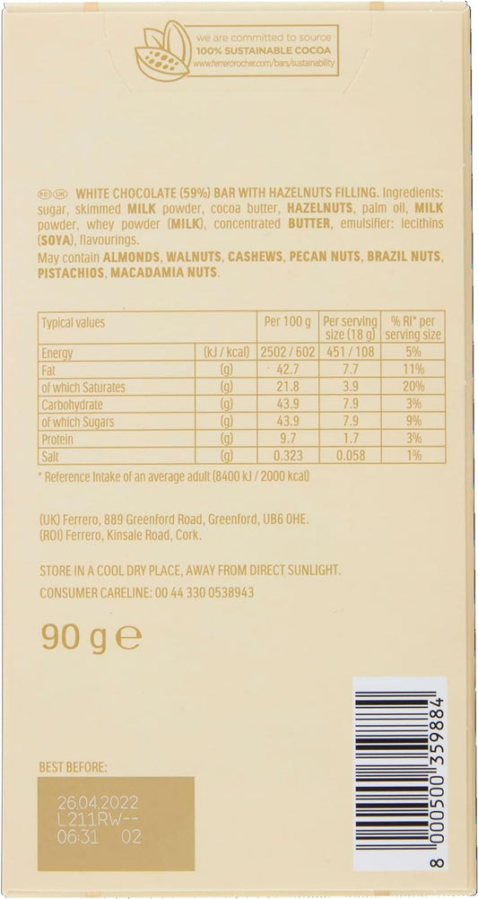 Ferrero Rocher White Chocolate Bar, Movie Night Snacks, Chocolate Gift with Crunchy Whole Hazelnut and Cocoa Filling, 90g