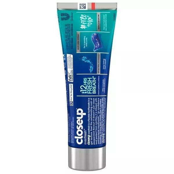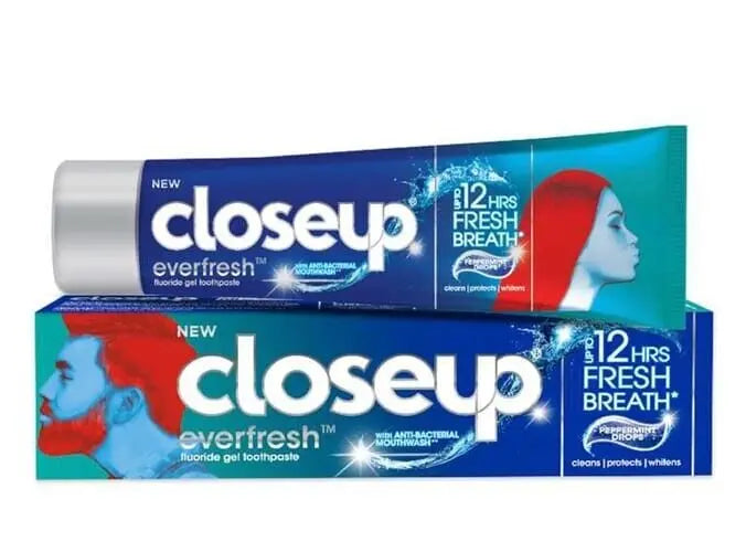 Closeup everfresh is a fluoride toothpaste in a gel texture. Feel the exhilarating rush of peppermint flavour! It doesn't just clean and protect from cavities, it is infused with anti-bacterial mouthwash** for confidence boosting 12 hours of fresh breath. Plus it contains micro-shine crystal for a sparkling white smile.