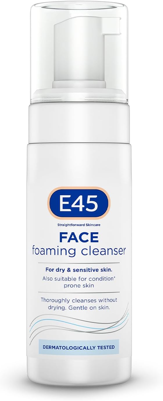 - HOW TO USE – Pump the cleanser onto the fingertips and massage into wet skin, then rinse. Use twice a day: morning and night and we recommend using the E45 Face Moisturiser after for long-lasting softness. The E45 Face Foaming Cleanser has been specially formulated to be used on dry and sensitive skin. Also suitable for those prone to eczema and dermatitis.